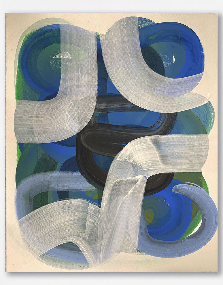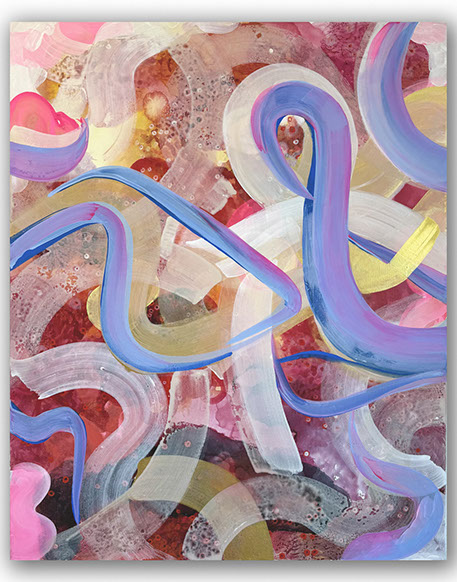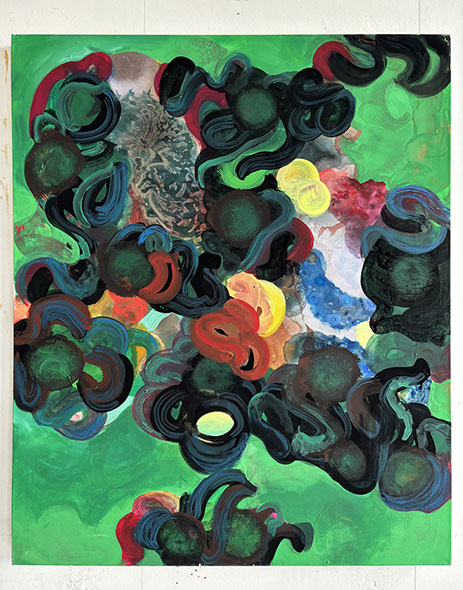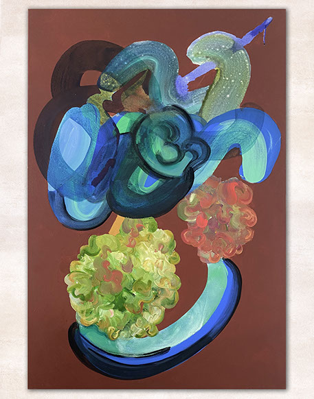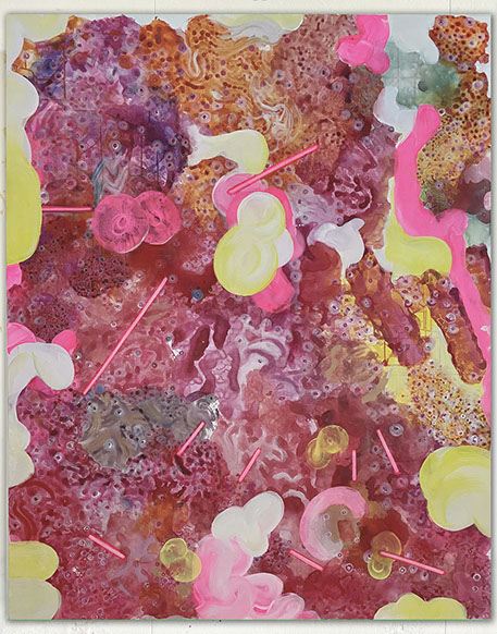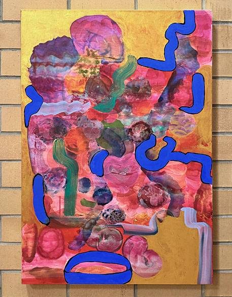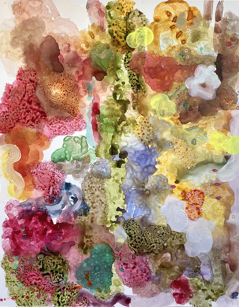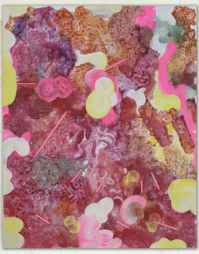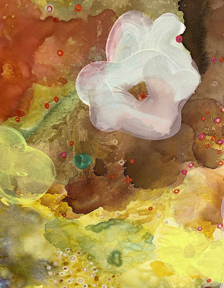 The paintings have a unique and developed relationship with color, often using fine lines and tiny circles, and speaks to themes of consciousness, and the micro vs. macrocosm within the human experience at the intersection of nature and technology.