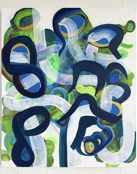 The paintings have a unique and developed relationship with color, often using fine lines and tiny circles, and speaks to themes of consciousness, and the micro vs. macrocosm within the human experience at the intersection of nature and technology.
